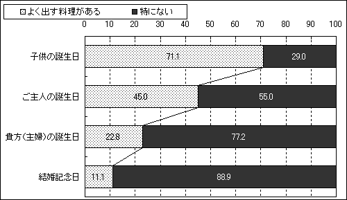 首都圏の主婦を対象に、日本で古くから行なわれている節句や暦の節目の行事に食べたり飲んだりする行事食に関する調査を実施した。すると、殆どの人に知られているようであるが、小正月の「小豆粥」(認知率48.2%、体験率24.7%)や七夕の「そうめん」(認知率27.7%、体験率22.3%)、重陽の節句の「菊料理」(認知率17.7%、体験率9.3%)は馴染みが薄そうに思える。行事食の中で、毎年出しているものでは「クリスマスケーキ」が最も多く、94.3%の家庭で登場している。次に「年越しそば」87.7%、お正月の「お雑煮」86.7%が続いた。回答を寄せてくれた主婦のうち、「母親などから行事食の作り方を教わった」69.9%事がある主婦は7割に上る。行事食に対する考え方を教えてもらうと、9割が「日本古来の食文化でとてもいいもの」94.0%、「自分の子供にも、日本の食文化として、教えていく必要がある」92.3%と好意的だが、一方で、「行事食とはいえ、それを食べる意味も分からずに食べる者が多い」60.7%という回答もあった。古くから伝えられる行事食以外にも、誕生日や家族の記念日など、特別な日によく出す料理を聞いたところ、一番多かったのは「子供の誕生日」71.1%で、次いで「ご主人の誕生日」45.0%が続いた。