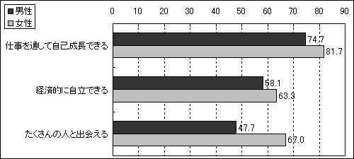 今年の新社会人を対象にしたアンケートによると、新入社員の社会に出る事への期待は男女ともに「仕事を通じての自己成長」(男性74.7%、女性81.7%)や「経済的な自立」(男性58.1%、女性63.3%)が上位に挙げられ、女性では「多くの人との出会い」67.0%への期待も高率であった。社会人としての仕事とは?こちらの質問でも男女ともに「自己実現・自己成長の手段」(男性67.2%、女性75.2%)、「お金を得る手段」(男性63.8%、女性56.0%)が1、2位を占め、女性では「出会いの場」33.9%が3位に上がっている。仕事観を見ると、ヒルズ族活躍の影響か?男性では「いずれは起業(独立)したい」が43.1%と、女性の16.5%を大きく上回っている。しかし、「一生、同じ会社に勤めようと思う」も47.1%と半数近くで、起業・独立志向との二極化傾向が見て取れる。最も回答率が高かったのは「趣味も仕事も両立し、多面的に暮らしたい」(男性93.1%、女性98.2%)で、新社会人のバランスの取れたライフスタイル志向が伺える。理想の上司トップは、男性上司では“実力・指導力”+“知的なイメージ”兼備の選手兼監督になった「古田敦也さん」、一方、女性上司は“知性的”で“スマート”、“落ち着きのある”など大人の女性のイメージが根強い「黒木瞳さん」と“したしみやすい”、“明るい”のバランスのとれた「山口智子さん」が同率でトップ。新人たちが目指すスポーツ選手に例えた社会人像は、男性は「結果を残す“松井秀喜/宮里藍”タイプ」32.2%、女性は「マルチタレント派の“D・ベッカム/M・シャラポア”タイプ」40.4%が支持を得ている。