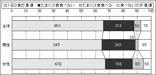 (1より)1日の食事の頻度を見ると「1日3食が普通」は65.8%を占め、「たまに3食食べない」が21.8%。全体的には極めて健全な食生活の様子が伺える。一方で、食生活で後悔している事として「食べ過ぎる事が多かった」30.5%や「塩分が多かった」23.8%、「早食いだった」22.8%などを挙げている。腸が「とても丈夫」な人は12.0%、「まあ丈夫」62.8%と合わせて74.8%は丈夫な腸の持ち主。男性71.5%より女性78.0%の方が腸は丈夫との結果に。腸の健康のためには半数が「乳酸菌を摂る」50.5%を挙げている。野菜、肉類、魚類の摂取状況で「よく食べる」の割合は、野菜42.3%、肉類11.8%、魚類29.5%。「あまり食べない」の割合が多かったのは肉類29.3%で、やはり健康を考えての事なのだろうか?今、関心のある事柄について聞くと「健康的な暮らし」72.0%がトップ、そして「ゆとりのある暮らし」62.8%、の2つが目立った。“住”に関して…自然の多い場所に住みたいという人は40.0%と、「そうは思わない」33.5%よりも多いものの、賛否が拮抗している。また、いつかは自分が育った場所へ戻りたい人は21.3%に過ぎず、育った場所への志向は弱そうである。最後に健康に関する情報源を尋ねると、「テレビ」が77.5%と多く、これに「新聞」64.8%、「友人、同僚」44.5%が続いている。