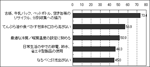 毎日の生活の中で、環境保全のために行っている工夫や努力で一番多かったのは「古紙、牛乳パック、ペットボトル、空き缶等のリサイクル、分別収集への協力」73.4%であった。ゴミの問題の原因は?と尋ねると、「大量生産/消費/廃棄の生活様式」62.8%と「使い捨て製品が身の回りに多すぎる」56.5%の2つが目立つ。日頃、ゴミを少なくするために心掛けている事を教えてもらうと、2人に1人が「詰め替え商品の使用」55.0%を挙げている。また、1度使ったものが再使用(リユース)、再生利用(リサイクル)されやすいように心掛けている事では「家庭ゴミは種類別に分け、指定場所に出す」82.2%が圧倒的に多く、次位「リサイクルしやすいように、資源ゴミの瓶は洗う」63.9%を引き離している。容器包装廃棄物の発生抑制の観点から、レジ袋の無料配布を禁止する動きがあるが、どう思うか?聞くと、「賛成」55.1%(最も多い理由は「資源の消費を抑制できる」67.0%)、「反対」21.9%(同様に、「レジ袋などは家庭で再使用しており、無駄にはしていない」73.6%が最多)、「賛成・反対いずれでもない」23.0%という結果に。性別に見ると大きな差は見られなかった。自動車の使用で引き起こされる環境問題では何が一番問題か?「大気汚染」52.3%を挙げた人が半数を超え、性別でも大きな差は見られなかった。自動車公害防止のために、利用の自粛や交通の制限等の協力を求められた際には「協力する」との人は86.6%と極めて多い。