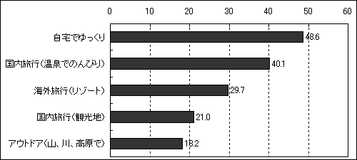 夏休みは自宅でゆっくりー。実施先がまとめた夏に関するアンケート調査によると、理想の過ごし方、現実(実際)の過ごし方とも「自宅でゆっくり」が1位となった。連続で取れる平均日数は会社員・公務員で5.4日と短い事に加え、“現代人が疲れている”(実施先)ゆえに自宅でのんびりを志向するケースが多いと見ている。現実の過ごし方で「自宅でゆっくり」の割合は67.0%で、以下「帰省」24.1%、「国内旅行(温泉でのんびり)」15.1%と続く。お盆の季節、ふるさとへの帰省の楽しみは「両親兄弟の笑顔」59.7%が断然トップ、しかし、その一方で「帰省費用の負担」46.5%や「道路、電車の混雑」33.8%を気にする人も少なくない。懐かしい響きのある“ふるさと”という言葉。思い浮かべるものでは「自然(海、山、川)」が66.2%で1位、以下「方言」31.9%、「母の手料理」24.2%と続く。暑い日が続く毎日。夏と言えば思い浮かぶ風物詩を聞いてみると、やはり「花火」34.6%がトップ。「風鈴」20.5%の音を聞き、「すいか」8.9%を食べながら、縁側で花火をみる、日本の夏のイメージは、意外と古き良き時代の夏そのままのようである。子供時代には嫌だった夏休みの宿題~大人になった今、もう一度やってみたいと思うものを問うと、「自由研究」30.2%、「図画工作」28.5%、「ラジオ体操」19.7%がトップ3で、男性は「昆虫採集」25.0%(女性は4.9%と少数)、女性は「ドリル(算数・国語)」24.4%(小学校時代、女の子は皆宿題をやってきたが、直前になって写していた男の子はいなかった?)が上位に。最後に夏のイメージする有名人を・・・この時期どこかで必ず流れているせいか、「サザンオールスターズ」と「TUBE」を挙げた人が多い。