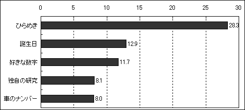 宝くじ長者白書に続いて、今度は数字選択式宝くじ“ナンバーズ”及び“ロト”の高額当せん者のモデル人間像を見ると・・・ラッキーな星座/イニシャルは男性が「水瓶座」9.6%の「T.Kさん」(例えば、くさなぎつよしさん、こむろてつやさんetc)、女性は「乙女座」10.3%の「M.Kさん」(くらきまいさん、かんのみほさんetc)。購入時にこだわるポイントは「数字の選び方」が断然トップの43.4%。当せんした数字を選んだ理由は「ひらめき」28.3%が1位で、「誕生日」12.9%、「好きな数字」11.7%と続く。数字選択式宝くじの大きな特徴は自分で好きな数字を選び、好きな口数を購入できる事である。では、当せん者は?4人に1人が購入する際に「5通り」23.7%購入している(当せんした組み合わせの口数は「1口」が38.0%で1位、以下「5口」10.3%、「6口以上」8.9%、「2口」6.6%、「3口」3.2%の順)。当せんの秘訣は高額当せんだけに「運」42.1%に恵まれたと思っている人が多いが、「継続・忍耐」30.4%や「ひらめき」18.7%など、実力で勝ち取ったと考えている人も少なくない。好きな数字を選べるゆえに、当せん者には好きな数字、嫌いな数字があるのでは?尋ねると、好きな数字は“ラッキー7”と言われるだけに「7」9.5%が最も多く、反対に嫌いな数字は“不吉”とされる「4」11.6%、次いで「9」6.6%であった。
