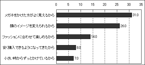 メガネの日(10月1日)にちなみ、メガネユーザーを対象に同テーマのアンケートを行なったところ、最近のメガネブーム(“メガネ男子”やメガネをかけた有名人が増えたなど)の影響か、全回答者の58.5%が「メガネが好き」と応えた。メガネが好きな理由で最も多かったのは「メガネをかけた方がよく見えるから」31%。一方、嫌いな理由では「煩わしいから」61%が6割と、極めて多い。メガネを買い換えようと思う時について尋ねると、2人に1人が「度数が合わなくなった、見え難くなった時」51%を挙げている。メガネを購入する店のポイントトップ3は「価格」72%、「品揃え」67%、「接客、お店の雰囲気」58%という順になった。メガネ店で嬉しかったサービス、望むサービスとして、多くの人が挙げていたのが「無料修理、クリーニング」であった。メガネが似合うと思う有名人は誰か?を尋ねると、男性部門では、メガネ姿がすっかりおなじみのプロ野球監督の「古田敦也さん」が堂々1位。女性部門は実施先のイメージキャラクターの「高木美保さん」が1位に輝いた。自然体で知的なその姿は高い支持を得ているようだ。