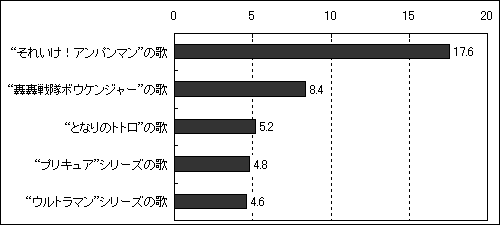 0歳から12歳の子供の保護者に“お子様の好きな歌は何ですか?”というテーマでアンケート調査を行ったところ、「“それいけ!アンパンマン”の歌」が0歳~5歳から圧倒的な人気を集めて総合1位となった。「それいけ!アンパンマン」は、毎年実施している「お子様の好きなキャラクターは何ですか?」の調査結果で2001年から5年連続で総合1位を獲得している人気キャラクターで、その人気がそのまま票に反映される結果となった。「アンパンマンの歌が好きでよく口ずさんでいます」や「アンパンマンのマーチが聞こえると、マネをして踊り出します」といったコメントが寄せられており、子供達が日頃からアンパンマンの歌に親しんでいる様子が窺えた。また、0歳~2歳では、昔から歌い継がれている童謡の「いぬのおまわりさん」「ぞうさん」「大きな栗の木の下で」「げんこつ山のたぬきさん」が上位に。これらの4曲は、幼稚園・保育園の歌の時間やNHKのTV番組「みんなのうた」や「おかあさんといっしょ」などでよく歌われている曲で、振りを付けて体を動かして歌える事も人気に繋がったようだ。総合2位には「宙船(TOKIO)が入った。この歌は、日本テレビ系列で昨年放送されたドラマ「マイ☆ボス マイ☆ヒーロー」の主題歌として使用され、ドラマの影響もあってか小学生を中心に高い人気を集めた。「たらこ・たらこ・たらこ(キグルミ)」はTVCMで反響を呼んで、幅広い年齢層から人気を集めて総合3位に登場。「軽快なリズムが好きで、よく歌いながら踊っています」といったコメントが寄せられており、音楽のリズムや面白い振り付けに好感を持っているようだ。
