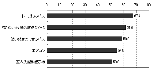 賃貸住宅ユーザー、オーナー、不動産会社3者を対象に、賃貸住宅に関するアンケートを行った。まず、「古い」と思う物件の築年数は賃貸住宅ユーザー(以降、ユーザーと称す)、不動産会社ともに「築20年以上」の割合が多かった。また、「駅から遠い」と思う物件の徒歩分数でも、双方、「徒歩15分以上」の割合が多かった。ユーザーにとって無くては不便な設備では「トイレ別のバス」67.4%がトップ、賃貸住宅オーナー(以降、オーナーと称す)が空室対策のため設置したいと思う設備は「ピッキングされにくい鍵」「地上波デジタル対応」「温水洗浄便座」などが上位に挙げられ、不動産会社が広告を行う際に強調したい設備トップ3は「トイレ別のバス」「室内洗濯機置き場」「エアコン」であった。ユーザーが生活する上で気を付けている事は「生活騒音を出さないようにする」70.2%が1位、これに「ごみの出し方」66.5%、「家賃滞納もしくは入金遅れがないようにする」66.2%が続いた。最近の入居者マナーで好ましくないと思う事を挙げてもらうと、不動産会社は「生活騒音」57.5%、オーナーは「ごみの出し方」38.4%を問題視している。
