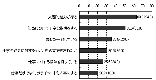 2007年度入社の新入社員を対象に意識調査を実施した。まず、新入社員に理想の上司・先輩像を尋ねたところ、「人間的魅力がある」63.0%が最も多く、これに「仕事について丁寧な指導をする」50.6%が続いた。反対に上司・先輩である社員に、新入社員への日頃の対応・指導の仕方における自己評価像を尋ねたところ、「人間的魅力がある」は24.0%、「丁寧な指導をする」は38.0%にとどまった。上司・先輩社員で自分を「仕事を任せて見守る」タイプと見る割合は48.0%となったが、これを理想と考える新入社員は6.0%に過ぎず、また、自分が「部下の意見・要望を傾聴する」(上司・先輩社員36.0%、新入社員18.4%)についても同様で、双方の間で理想像にズレのある事が浮かび上がった。これから仕事をしていく上で、同じ職場の人達や上司との人間関係に「不安はない」新入社員は3割ほどで、あとの7割はやはり程度の差はあれ、不安を抱いているようだ。仕事や職場の悩みを相談したい相手では、「社内の先輩」24.8%と「上司」4.7%を合わせるとおよそ3割で、社内での人間関係がまだ築かれていない新入社員でも、上司や先輩社員を相談相手として期待している。実力主義48.3%か年功序列49.1%か?今年はおよそ半々に割れる結果となった。仕事と生活のバランスについて、氷河期入社組とバブル期入社組、今年の新入社員の3世代に問うと、氷河期入社組は圧倒的に「仕事優先」傾向が強く、バブル期と今年の新入社員は似たような傾向があるが、氷河期に比べると「仕事優先」の割合は10%ほど低い。