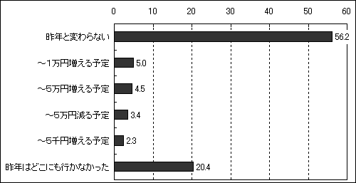 全国の20歳以上の会社員男女にゴールデンウィーク(以降GWと称する)に関する調査を行った。まず、GW中の休日について尋ねたところ、最も多かったのは「7日」で、これに「9日」「6日」が続いた。外出予定を見ると、「予定なし」が回答者全体の約4割を占め、「日帰りレジャー」や「国内旅行」が大半であった。外出予定者に一人当たりの予算を教えてもらうと、「1万円未満」32.2%と「3万円未満」29.0%の層が目立つが、約半数は「1万円未満(「5千円未満」17.8%を含む)であった。これを昨年のGWに使った一人当たりの費用と比較すると、「昨年と変わらない」56.2%という回答者が大多数。大型連休の過ごし方としては、「家でゴロゴロ」58.3%派が「アウトドア」41.7%派を上回っている。
