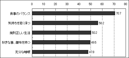 東京と大阪の20代から60代の女性を対象に、標記テーマのアンケート調査を実施した。まず、現在の健康状態を聞くと、「良い(「とても良い」11.5%+「まあ良い」32.5%)」と回答した女性が4割半ばで、健康に「自信がある(「とてもある」4.3%+「まあある」44.3%)」との女性は半数近くに及んだ。加齢によって得るもの失うものは?の設問に最も割合が高かったのは、<得るもの>では「豊富な知識や経験」、<失うもの>では「健康」であった。加齢による損失の大小については、「失うものの方が大」が18.5%、一方、「得るものの方が大」が34.8%と、加齢に対して前向きな姿勢が窺えた。今の容姿が実年齢より「若い(「かなり若い」3.5%+「少し若い」33.7%)」と考えている女性は37.2%に上ったが、「実年齢と同程度」48.5%には及ばず。この事に関連するためか「実年齢より若く見られたい」とする回答は76.8%に達し、「実年齢相応」は21.0%。若く見られたい年齢幅で最も多かったのは「3~4歳」37.3%だった。若さを保つために気をつけている事トップ3は「食事のバランス」「気持ちを若く保つ」「規則正しい生活」という順になった(2に続く)。