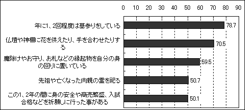 全国に居住する40歳から74歳の男女を対象に標記についてアンケート調査を行った結果、年中行事で実施率が高かったのは「初詣」76.4%と「お盆」74.0%で、子供の行事としての色合いが濃い「節分」83.8%→57.6%や「七夕」68.8%→17.5%は減少幅が大きくなっている。日頃、取っている宗教的行動は「年に1、2回程度の墓参り」78.7%や「仏壇や神棚に花を供えたり、手を合わせたりする」70.5%などの慰霊的行動の実施率が高い。何か特定の宗教や宗派を信仰しているか?を問うと、「信仰していない(「どちらかと言えばしていない」22.7%含む)と回答した人は66.9%で、「信仰している(「どちらかと言えばしている」21.8%含む)」という人は30.7%であった。信仰の度合い別に宗教的行動の実施率を見ると、「信仰している」人の実施率が目立って高かったのは「普段から礼拝、おつとめ、布教などの宗教的な行いをしている」などの<自己修養的行動>であった。一方、「年に1、2回程度の墓参り」などは「信仰していない」人でも実施率は74.2%に上っており、<慰霊的行動>は信仰に関わらず行われていると言える。<霊魂観念><向宗教性><加護観念>の設問を設定して、宗教的態度について尋ねた結果、8割以上の人が「宗教を信じていなくても幸福な生活を送れる」と回答、その一方で、「神や仏を粗末にすると、ばちがあたる」71.3%(男性67.2%よりも女性75.1%で肯定する人が多い)、「信仰は死に直面した時の心の支えになる」64.8%と考える人も多い。