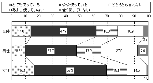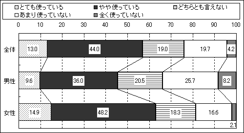 インターネット調査会社の(株)インフォプラントがiモードサイト「とくするメニュー」上で行った調査によると、自分のヘアケアについて「(とても+やや)気を使っている」との回答は、全体で61.9%、男性47.5%、女性69.4%という結果が出た。現在使用しているヘアケア用品は、男女ともに1位「リンス・コンディショナー」、2位「ヘアケア用シャンプー」と同じであったが、3位は男性が「マイナスイオンドライヤー」、女性は「トリートメント」であった。ヘアケア用品を購入する際に重視する事は、男性は「価格」56.5%がもっとも多く、これに「自分の髪に合う」46.9%、「メーカー・ブランド」40.8%が続いた。一方、女性は「自分の髪に合う」67.8%が最も多く、以下「価格」58.6%、「メーカー・ブランド」40.4%という順位になった。ヘアスタイリングへの気遣いについては「とても気を使っている」と「やや気を使っている」を合わせた合計は57.0%(男性45.6%、女性63.1%)であった。現在使用しているヘアスタイリング剤のタイプは、男性では「ワックスタイプ」36.8%がトップ、これに「ムースタイプ」31.2%、「スプレータイプ」20.0%と続き、女性でも「ワックスタイプ」39.4%が最も多く、「スプレータイプ」37.0%、「ムースタイプ」26.0%が続いた。ヘアスタイリング剤を購入する際の重視点は、男性では「価格」51.2%、「セット力・整髪力」49.0%、「メーカー・ブランド」36.0%、一方、女性では「価格」50.9%、「つけ心地(ベタつかないなど)」49.4%、「香り」41.6%などが上位に挙げられた。