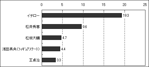 全国の20歳以上の男女を対象に人気スポーツに関する調査を実施した。その結果、最も好きなスポーツ選手は「イチロー」が3年連続の1位(性別・年代別全てにおいても1位)。さらに、野球選手では今年からメジャー入りした話題の「松坂大輔」が4位にランクされ、上位5人は全員、野球に関係する人が選ばれている。好きなプロスポーツでは過半数を占めた「プロ野球」の人気が依然として高く、12年連続の1位。「プロサッカー(Jリーグ)」が5年連続で2位をキープしている。好きな現役力士は横綱「朝青龍」が1位に(3年ぶり)。2位「高見盛」、3位「千代大海」と続く。新横綱の「白鵬」が昨年7位から4位に上昇した。一番好きなプロ野球チームは?93年の調査以来、「巨人」が1位、「阪神」が2位で、昨年の日本選手権優勝の「日本ハム」は5位であった。興味のある世界選手権では「フィギュアスケート」が45.7%と、次位以下の「バレーボール」28.3%や「水泳」27.6%を大きく引き離しており、また、日本で開催して欲しい世界選手権でも「フィギュアスケート」28.0%がトップで、2位「バレーボール」18.3%、3位「柔道」16.8%と続いている。