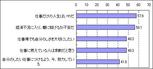 (1より続く)2009年から開始される裁判員制度について、「裁判員を務めたい」31.9%と考えている人は3割ほどで、「人を裁く事に抵抗」24.9%や「時間を割かれる」24.7%、「正しい判断をする自信がない」24.5%などを理由に、およそ6割の人が「勤めたくない」57.8%と回答している。仕事観に目を向けると、「仕事だけの人生はいやだ」57.6%がトップ。2位は「経済不況に入り、職に就けるか不安」56.1%と、新成人の職に対する不安が高いことが窺える結果となった。これから就職・転職活動をする上での不安は「社会人として適用するか」57.4%、「自分のビジネススキルが充分か」45.9%など、自分に対して自信を持てないでいる姿が浮かび上がった。交際相手の有無を問い、男女別で見ると、交際相手がいる割合は、男性20.5%に対し、女性は33.3%と女性の方が12.8p上回っている。恋愛に必要な事では「コミュニケーション力」72.2%が第1位に挙げられ、とりわけ、女性76.6%の方が男性67.9%よりも重視している。また、「外見・スタイル」についても、女性59.3%の方が男性42.8%よりも重視している。これまでの恋愛の形は?結果を見ると、『女高男低』の恋愛模様が見て取れる。現在の交際状況は低調であるものの、結婚意向についてはどうか?「早く、またはいずれは結婚したい」と考えている人は80.4%で、若干、女性82.1%が男性78.7%を上回っている(3に続く)。