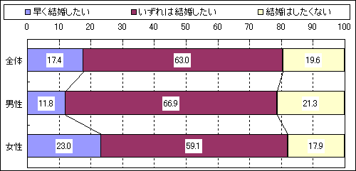 全体 男性 女性 全くの片思いの恋愛経験しかしてこなかった 13.6 13.0 14.1 恋愛をした数だけ、自分が失恋してきた 8.4 10.4 6.5 どちらかと言うと、自分が振られる方が多かった 21.6 25.4 17.9 どちらかと言うと、自分から振る方が多かった 25.6 18.6 32.5 恋愛をした数だけ、自分から全て相手を振ってきた 4.4 3.1 5.7 はっきりとわからない・恋愛の経験はない 21.3 26.6 16.0 - 結婚の意向