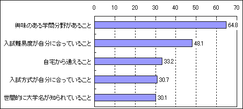Benesse教育研究開発センターが全国の大学生を対象に行った調査によると、大学進学を意識し始めた時期は、「高校2年生の頃」が29.5%と最も多く、以下「高校3年生の頃」24.3%、「高校1年生の頃」17.8%と続き、7割程度が高校の時に大学進学を意識しているという結果となった。受験する大学・学部を決める際に重視した点として、「興味のある学問分野があること」64.8%、「入試難易度が自分に合っていること」48.1 %、「自宅から通えること」33.2%などが上位に挙げられた。受験校全体に関しての入試方法について尋ねると、「一般入試」70.2%や「センター入試」58.5%が過半数を超え、「推薦入試」26.8%も4人に1人の割合だった。性別で見ると、女子は男子に比べ、「推薦入試」(女子31.2%>男子23.8%)や「AO入試」(9.7%>7.5%)を経験した学生が多い傾向が示された。大学受験対策として取り組んだことでは、「センター試験に対応した教科学習」66.8%が最も多く、次いで「私立大学入試に対応した教科学習」43.8%、「国公立二次試験に対応した教科学習」39.0%という順であった。現在の大学・学部に進学したときの気持ちとしては、全体では「ぜひ入りたいと思って進学した」が32.4%、「まあ満足して進学した」が45.7%、で、両者を合わせるとおよそ8割の学生は現在の大学に満足感を持って入学していることになる。さらに入試難易度別で見ると、入試難易度が高い大学ほど志望度が高いことが確認できる。また入試難易度の偏差値『45以上50未満』『45未満』では、「やむをえず進学した」との回答が1割程度見られた。現在通っている大学について最も満足度が高いのは、「施設・設備(図書館やインターネットの利用など)」に関することであった(「とても満足している」26.1%+「まあ満足している」49.9%=76.0%)。なお「進路支援の体制」49.5%は全体では5割を下回っているが、学年別に見ると、3年生が54.5%、4年生が51.8%と5割を超えているが、まだ十分であるとはいえない状況である((2)に続く)。
