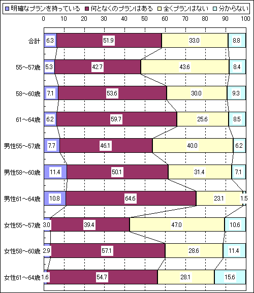 合計 男性 女性 55-57歳 58-60歳 61-64歳 急な出費に備えて 29.0 27.1 30.2 29.8 31.5 25.0 自分の自由にできるお金が欲しい 23.4 28.8 19.8 21.3 20.4 29.5 今後の生活費に充てたい 8.3 6.8 9.3 6.4 11.1 6.8 蓄財のため 8.3 3.4 11.6 6.4 11.1 6.8 お小遣いの足しにしたい 6.2 5.1 7.0 8.5 7.4 2.3 やりたいことがある 5.5 11.9 1.2 6.4 1.9 9.1 欲しいものがある 4.1 6.8 2.3 2.1 3.7 6.8 - あなたは今後の人生にプランを持っていますか? (単位:%)