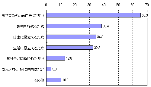 (株)キャリア・マムが実施した「習い事に関するアンケート」によると、回答を寄せた女性のうち、4分の1が何らかの習い事をしている(24.0%)。習い事トップは「英会話/語学」25.2%。ひと月あたりの費用は、「5,000円~1万円」43.4%という層が最も多く、全体の4割だった。「5,000円以内」33.1%が3割と第2位に付けている。一方で、2割の人が選んだのが「1~3万円」19.4%。ひと月にこれだけ払う習い事は本格的。趣味を極めたり、資格を取るなど真剣さが問われる料金である。習い事を始めた理由は、「好きだから、面白そうだから」65.3%が65%以上。「趣味を極めるため」38.4%、「仕事に役立てるため」34.3%、「生活に役立てるため」32.2%は、それぞれ3割前後の女性が選んでいる。一方、これから取り組みたいことでは、「仕事に役立つこと」61.6%が「生活」45.1%と「趣味」42.3%を上回った(第1位は「好きなこと、面白そうなこと」66.0%だった)。『なかなか続かない』という人も多いのが習い事。続けやすい条件について聞いてみると、第1位は「費用がリーズナブル」で、なんと94.7%の女性が選んでいる(『やっていない/やめた理由』を別の設問で尋ねたところ、7割が「費用が高い」を選んだことからもそのことがわかる。『やっていない/やめた理由』の第2位は「時間がない」。続けられる条件の第2位でも「曜日や時間、日程の変更がしやすい」75.6%が挙がっている)。習い事の形態は多様。してみたいのは、ごく一般的な形である「通学型・集団」59.4%を希望する声が6割に達しているが、「通学型・個人」36.6%の希望者も3割以上見られる。また、『eラーニング』と呼ばれる「自宅型・インターネット通信教育」30.5%が3割と、通信教育の中ではトップでランクインしていることは注目して良いだろう。自己啓発を始めたいと思うときは、「時間」66.0%や「生活」63.9%に余裕ができたときが圧倒的に多く、次いで「自分にもの足りなくなったとき」34.7%が続いた。