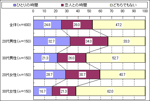 不動産総合情報サービスのアットホーム(株)は、20代から30代の恋人がいる独身男女を対象に、恋人と住まいの関係に関する調査を行い、3割以上の女性が『住んでいる場所で相手の経済力を推測する』ことや、『賃貸契約更新』が同棲や結婚の契機になること、また20代男性に『恋人と会う時間より、ひとりの時間の方が大切』と考えている人が多いことなどがわかりました。まず、自身と恋人の居住形態について尋ねると、回答者(48.3%)、恋人(49.8%)ともに、「親と同居」が半数、「一人くらし」は回答者は39.5%、恋人は34.7%でした。『住んでいる場所で相手の経済力を推測したことがある』という人は30.0%で、男性(27.3%)より女性(32.7%)で多く、また、女性の4人に1人(25.7%)が『住んでいる場所で相手のポイントがアップしたことがある』と回答しています。自宅から恋人宅までの所要時間を聞いたところ、「45分~1時間」が23.2%で最多。以下「1時間~2時間」22.5%、「15分~30分」20.1%と続き、平均は「81.9分」でした。また理想は、「15分~30分」が49.9%、「15分以内」が24.9%で、「30分以内」が4分の3を占め、平均は「33.1分」と、現実より「48.8分」も近くなっています。週に恋人と会う回数、また理想の(会う)回数を尋ねると、「週1回」41.7%(男性45.0%、女性38.3%)というカップルが最も多く、平均は「2.1回」となりました。女性の5人に1人(20.0%)は、週に1回も会えない(会わない?)ことが明らかになりました(「週に2回会いたい」と考えている女性は29.0%と、男性の19.0%を10pt上回っています)。恋人と会う時間とひとりの時間、どちらが大切か聞いたところ、「どちらでもない」47.2%が最も多く、『どっちが大切かといわれても…』という感じですが、20代は男女とも「ひとりの時間」を選ぶ人が多く、特に男性は3割(32.7%)を超えています。恋人よりも大切なひとりの時間、一体、何をしているのでしょうか?『同棲』については、「すべき(してもよい)」60.0%と思っている人が6割に。賃貸契約更新時に、恋人との『同棲/結婚』を考えたことがありますか?『同棲』を考えたことがある人は全体の4割超(40.7%)に上りました。これを男女別に見ますと、「考えたことがある」男性が37.8%であるのに対し、女性は44.9%と、女性の方が7.1pt多くなっていることがわかります。『結婚』については、4人に1人(26.4%)。ただ男女別では、『同棲』とは逆に、「考えたことがある」のは男性が32.3%と、女性(18.0%)より14.3pt多くなっており、男女で微妙な温度差もあるようです。