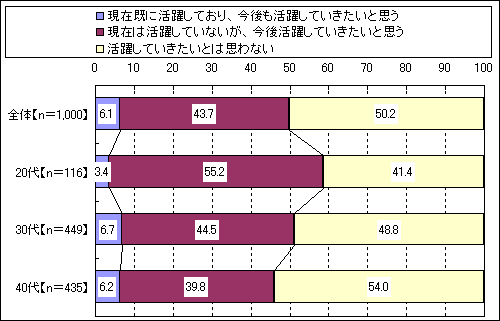マンツーマン専門の英会話スクールを運営する(株)GABAでは、COP15と国際貢献に関する意識調査を実施しました。仕事で英語の使用経験がある人に、仕事において、『海外で』または国境を越えて『グローバルに』活躍していきたいと思うかを尋ねたところ、「現在すでに活躍しており、今後も活躍していきたいと思う」6.1%、「現在は活躍していないが、今後活躍していきたいと思う」43.7%、「活躍していきたいとは思わない」50.2%となり、年代別で比較すると、「グローバルに活躍していきたい(「現在すでに活躍しており、今後も活躍していきたいと思う」と「現在は活躍していないが、今後活躍していきたいと思う」との合計)は、20代58.6%、30代51.2%、40代46.0%となりました。20代では「現在は活躍していないが、今後活躍していきたいと思う」が55.2%と、他の年代よりも高くなっており、今後の活躍が期待されます。仕事において、『海外で』または国境を越えて『グローバルに』活躍していきたいと回答した人に、その地域を聞いたところ、「アジア」40.0%が最も多く、次に「ヨーロッパ」24.3%、「北アメリカ」20.9%となり、男女別に見ると、男性では「アジア」47.6%が突出して高く、女性では「アジア」32.1%、「ヨーロッパ」30.1%と2地域に集中。特に「ヨーロッパ」は男性より女性の方が11.4pt高くなっており、女性に人気の地域となっていることが窺えます。次に、国際貢献をしたいと思うかを尋ねると、「したい(「機会があればしたい」66.0%を含む)」が72.4%となり、7割強が「国際貢献をしたい」と思っていることがわかりました。全回答者に、環境問題への関心度を聞くと、「関心がある(「非常に関心がある」20.4%、「ある程度関心がある」70.1%)」が90.5%と、9割を超える結果となり、関心の高さが見られました。『国際貢献をしたい』と回答した人は環境問題への関心がさらに高く、「関心がある」が96.5%でした。様々ある環境問題5項目に対して、それぞれどう捉えているかを聞きました。「内容を知っており、真剣に捉えている」割合は、<地球温暖化>59.3%、<酸性雨・大気汚染>50.7%、<フロンガス排出によるオゾン層破壊>56.2%、<放射性廃棄物>48.2%、<乱獲、密漁、珊瑚礁破壊等による生態系破壊>50.5%という結果でした。COP15についての認知を聞いたところ、「内容を詳しく知っている」7.4%、「内容を知っている」37.7%となり、合計すると45.1%が「内容を知っている」ということがわかりました。また、「名称は聞いたことがある」は38.7%となっており、COP15の認知率は83.8%となっています。COP15のニュースや協議の結果を見て思うことをそれぞれ聞いたところ、「あてはまる」と回答したのが最も多かったのは「温室効果ガス削減は、グローバルな重要課題だと思った」で86.6%となりました。