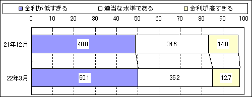 日本銀行が全国の満20歳以上の男女を対象に「生活意識に関するアンケート調査(第41回)」を実施した。その結果を昨年12月の前回(第40回)調査の数値と比較した。1年前と比べた現在の景況感は「良くなった」が僅かに増加、「悪くなった」が4.6ポイント減少。一方、現在と比べた1年後の景況感は「良くなる」が0.6ポイント増加し、「悪くなる」が4.6ポイント減少した事から、景況感は前回調査より改善した。金利水準についての見方は「金利が低すぎる」との回答が前回調査の48.8%から50.1%に1.3ポイント増加した。現在の暮らし向き(1年前対比)は「ゆとりが出てきた」が0.7ポイント増加し、「ゆとりがなくなってきた」は2.5ポイント減少している。1年前と比べた収入の増減では、「増えた」が1.2ポイント増加、「減った」が3.1ポイント減っている。また、支出の増減については、「増えた」が0.5ポイント増加し、「減った」が2.8ポイント減少した。1年後を見た勤労者の勤め先での雇用・処遇についての不安は「あまり感じない」が2.0ポイント増加、「かなり感じる」は2.9ポイント減少している。「少し感じる」は1.1ポイント増加した。『電子マネー』と聞いて何を思い浮かべるかと尋ねたところ、「あらかじめ入金(チャージ)しておいたICカードや携帯電話を端末にかざして、代金を支払うこと」65.1%との回答割合が最も高かった。次いで「ICカードや携帯電話を端末にかざして代金を支払い、銀行口座で後払いすること」38.2%、「クレジットカードを提示し、暗証番号を入力して代金を払うこと」25.6%、「インターネット上の電子的な財布にあらかじめ入金しておき、それを使って、代金を支払うこと」19.3%との回答割合が高かった。