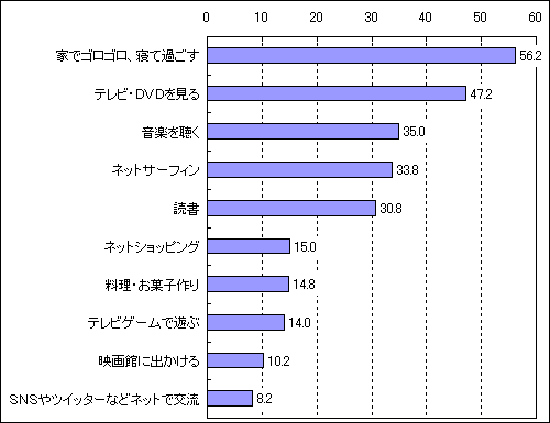 (株)マクロミルは、梅雨がない北海道を除く全国の20歳以上の男女を対象に、「梅雨に関する調査」を実施しました。最初にじめじめと雨が続く梅雨の季節。雨の日を楽しく過ごす方法について尋ねたところ、「家でゴロゴロ、寝て過ごす」56.2%、「テレビ・DVDを見る」47.2%、「音楽を聴く」35.0%がトップ3となりました。天気予報をチェックする方法について尋ねました。「テレビ」84.6%最も多く、次いで「パソコンのインターネット」66.4%、「携帯電話のインターネット」31.0%となっています。外出時に、天気予報で【降水確率】が何%なら傘を持って行くか?を尋ねると、「50%」を基準とする人が最も多く、【降水確率】が50%に達すると傘を持って出かける人は6割超となりました。雨の日に悩ましく思うことを男女別に見ると、男性は外を出歩く機会が多いためか「靴や服が汚れる」57.2%が最も高く、一方、女性は「洗濯物が乾かない」78.4%、「部屋の湿気やカビ」58.0%が上位2位となっています。雨の日に、周囲の人の立ち振る舞いや傘の使い方など『マナーの悪さ』を感じたことがある人は79.0%と約8割に達しています。マナーが悪いと思う人はどんな人か?尋ねたところ、「周りを確認せず傘の露を払う」37.6%、「周囲を確認せずに急に傘を開く」35.2%、「人とすれ違う時に傘をかしげない」32.0%となっています。梅雨になると体に不調を感じることがあるか?尋ねたところ、36.6%の人が「ある」と回答。男女別に見ると、女性で「ある」と回答している人は46.4%と男性に比べ20pt高くなっています。どのような症状か?尋ねたところ、男女別に見ると、女性は男性に比べ「頭痛」と「気分が沈みがちになる」が10pt前後高くなっています。梅雨の時期、体調管理のために気をつけていることがあるか?尋ねたところ、20.8%の人が「ある」と回答しています。どのようなことに気をつけているか?尋ねたところ、「冷たい食べ物・飲み物をとりすぎない」49.0%が最も多く、次いで「睡眠を十分とる」43.3%となっています。
