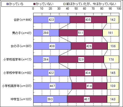 ペットについて、全国の小学生・中学生を中心としたサークルリンク会員に対し調査を実施しました。家でペットを飼っているかについて尋ねたところ、「かっている」が全体の42.3%、「かっていない」が43.5%、「前はかっていたが、今はかっていない」が14.2%という結果になり、6割近くの子どもが今現在ペットを飼っている、あるいはこれまでにペットを飼った経験がある、ということがわかりました。性別で見ると、「かっている」では男の子が29.8%、女の子が43.8%となり、男の子よりも女の子の方がペットを飼っている割合が多くなりました。飼っているペットについて尋ねたところ、「いぬ」が全体の42.6%と最も多く、次いで「金魚」31.4%、「ねこ」20.2%と続き、性別で見ると、「インコ」や「かめ」では女の子よりも男の子の回答が多くなりました。ペットを飼うことになったきっかけについて尋ねたところ、「買った」が全体の65.4%とかなり多く、次いで「もらった」27.7%、「ひろった・つかまえた」20.7%と続き、性別で見ると、「ひろった・つかまえた」や「前からいたペットが子どもを産んだ」では女の子よりも男の子の回答が僅かながら多く見られました。ペットの世話としてやっていることでは、「えさをあげる」が全体の79.8%と最も多く、次いで「遊んであげる」64.9%、「そうじをする」35.1%と続き、性別で見ると、「さんぽにつれていく」「トイレの片づけをする」「遊んであげる」では女の子よりも男の子の回答が多く見られ、男の子の方がより積極的にペットの世話をしている様子が窺えました。ペットを飼っていないと回答した子供に理由を尋ねたところ、「かぞくに反対されたから」が全体の27.0%と最も多く、次いで、「マンションの決まりなどで、かえないから」26.6%が僅差で続きました。性別で見ると、「マンションの決まりなどで、かえないから」では男の子よりも女の子の回答が多く、また「家族や自分にどうぶつのアレルギーがあるから」でも男の子よりも女の子の回答が若干多く見られました。『ペット』からイメージすることについて尋ねたところ、「かわいい」が全体の85.4%と最も多く、次いで「楽しい」63.7%とポジティブなイメージが上位を占めましたが、3位には「おせわがたいへん」38.3%が続き、ネガティブなイメージも見られました。性別で見ると、「かわいい」では男の子が59.6%、女の子が88.4%となり、男の子に比べ女の子の回答がかなり多くなっていました。