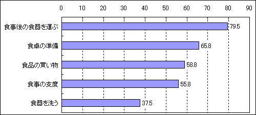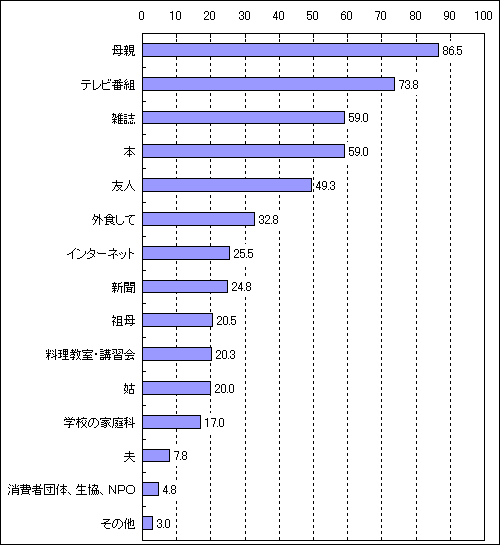 (先月号より続く)『安全な食』のための対応や、生活習慣として、実行していることを尋ねたところ、最も多かったのは、「原産地を確認する」79.3%でした。以下「なるべく手作りする」68.5%、「食品の表示をよく読む」65.5%が続きました。『出来合いの惣菜』について、どう考えているのでしょうか?「すぐ食べられて便利」79.8%が第一。そして、「少量欲しい時によい」46.0%、「自分では作り難い料理が食べられる」43.0%などの利点が上位に挙げられましたが、「価格が高い」49.8%や「味が濃い」39.5%などの『否定的な』意見も見られました。自分自身や家庭の食生活について望んでいること、実現していることを尋ねました。その結果、4人に3人以上が、「料理のレパートリーが多い」85.0%、「なるべく手作りする」82.3%、「料理が上手」78.8%、「安全な食品を利用する」74.5%を望んでおり、また、実現していることでは、5人に2人以上が、「なるべく手作りする」76.3%、「夫や子どもの弁当を作る」51.5%、「食事の支度にあまり時間をかけない」43.3%、「食事中の会話が多い」41.0%を挙げました。料理や食についての知識を、主に誰から教わったり、何からとり入れてきましたか?「母親」86.5%が最も多く、やはり、家庭の味は『母から子へ』と伝承されていくのでしょうか。次いで「テレビ番組」73.8%、「雑誌」と「本」各59.0%といったメディア関連が続いています。子育てをする中で、食べ物や食事について、子どもに言い聞かせたり、守らせようとしたことを尋ねてみたところ、「食べ物を粗末にしない」84.8%が最も多く、「好き嫌いをしない」82.5%、「いただきます、ごちそうさま、と言う」79.8%が続き、また、参加・実行させてきたことでは、「食事後の食器を運ぶ」79.5%が最も多く、以下「食卓の準備」65.8%、「食品の買い物」58.8%が続きました。『食事の支度』をさせたという人に、第一子にはどんなことをさせたのか尋ねてみました。「野菜などの皮をむく、切る」79.4%が最も多く、以下「お米をとぐ」69.1%、「料理を作る」64.6%の順となっています((4)に続く)。