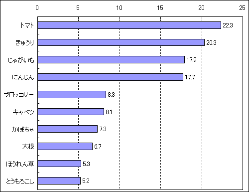 (株)バンダイでは、3歳から12歳の子どもの保護者を対象に、8月31日の『野菜の日』に向けて、『お子様の好きな野菜、嫌いな野菜は何ですか?』というテーマでアンケート調査を実施した。今回の調査では、好きな野菜の総合1位は「トマト」27.2%で、特に女の子(32.1%)から高い支持を集めた。『我が家ではトマトにお砂糖をかけて、フルーツ感覚で食べるからだと思います』や『ミニトマトが好きです。野菜というより、果物だと思って食べています』のコメントのように、トマト独特の甘みが果物を連想させることから、子どもから高い人気になっているようだ。また、3位にはトマトと同様に、甘みがあるいう理由から「にんじん」17.6%が入った。『かぼちゃやにんじんなどの甘みのある野菜が好きです。今日もゆでただけのにんじんをパクパク食べていました』といったコメントが見受けられ、こどもたちにとって『甘み』は野菜の好き嫌いの判断において重要な要素になっているようだ。その他、「にんじん」は『ほのかな甘みとにんじんの色が好きなようです』のように『色』を好きな理由とした回答も寄せられた。甘めの味に加えて、トマトやにんじんの『赤色』や『オレンジ色』など暖かみのある色が、子どもたちの食欲をそそるのかもしれない。好きな野菜の2位には、「きゅうり」19.3%がランクインした。『大好きなきゅうりは、お味噌やマヨネーズをつけて丸かじりでボリボリ食べています』や『おやつ代わりにいつも食べています』といった回答が多く寄せられており、調理をしなくても食べられる手軽さが、こどもたちの間食として身近な野菜になっているようだ。