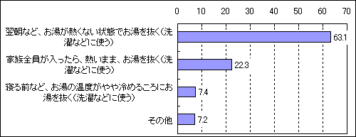 私たちの生活を潤し、身近な自然であるはずの川について、私たちはどのくらい知っているでしょうか?「川」とのつながりをエコと安全を切り口に尋ねてみました。下水に流す『油の量』が自然環境に影響することを知っているか?尋ねたところ、ほぼ全員が知っていました(「よく知っていた」46.9%+「なんとなく知っていた」51.0%)。一方、下水に流す『水の温度』が自然環境に影響することを知っていた(「よく知っていた」10.3%+「なんとなく知っていた」26.9%)人は4割ほど(37.2%)でした。お風呂の残り湯はいつ湯船から抜きますか?朝、風呂水を使って洗濯する家庭が多いためか、「翌朝など、お湯が熱くない状態でお湯を抜く」63.1%という人が6割を占めました。シャンプーを泡立てて髪を洗っている間のシャワーの状態を尋ねますと、64.1%が「シャワーは一旦止め、洗い流す時に再び出す」としていますが、「シャワーは普通に出したまま洗髪を続ける」9.7%人も1割ほどいることが明らかになりました。エコを意識する頻度の変化の理由を尋ねました。「子どもによりよい地球を残したいから」33.4%がトップ、以下「環境問題についてよく聞くようになったから」32.5%、「環境問題が身近に感じられるようになったから」28.6%と続きました。夏場、特に遊びの場としてクローズアップされる川や海―危険や汚いことを理由に遊ばせたくないとする親も多いようですが、危険対策として『ライフジャケット』の着用について尋ねると、「購入してでも着用させたい」という人は14.4%、一方、「無料貸出があれば着用させたい」41.5%、「レンタルなどがあれば着用させたい」21.5%を合わせた『費用がかからなければ着用させたい』という人は63.0%でした。また、子供用のライフジャケットを購入してもよい価格を尋ねました。「~2,000円」25.6%が最も多く、次いで「~3,000円」21.8%、「~1,000円」14.6%の順となりましたが、4人に1人は「買うつもりはない」23.1%と回答しています。