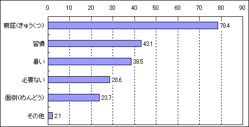 外で会う最近の主婦は、かつてに比べて格段とおしゃれになりました!では、お風呂上りのリラックスタイム、主婦たちはどのようなスタイルで過ごしているのでしょうか?調べてみました。夜の入浴後、寝るまでの間、通常はどんな服を着ているのか?尋ねたところ、さすがに入浴後のリラックスタイム、大半がラフなスタイルをしており、「パジャマ」派(46.4%)と「Tシャツなどのラフな服」派(46.9%)がほぼ全体を二分しました。入浴後、ブラジャー(パット付き衣料含む)を着けていますか?との質問に、入浴後はたいていノーブラ(「着けていない」62.4%)であるという『アンチ夜ブラ派』が4分の3を超えました。入浴後もブラジャーを着ける『夜ブラ派』は24.6%でした。入浴後もブラジャーを着けると回答した『夜ブラ派』にその理由を尋ねたところ、最も多かったのは、「服の上からバストの形や乳首などが見えないようにする」55.4%、次いで「バストが安定するから」39.1%、「習慣だから」34.8%と続きました。その一方、夜、家で入浴後にブラジャーを着けていることに抵抗はないですか?との質問に、『夜ブラ』が自然に習慣になっている女性のうち3割が「できれば着けたくない」32.6%と回答しました。全体の6割を占める『アンチ夜ブラ派』に、入浴後、なぜブラジャーを着けないのか?その理由を尋ねると、その8割が「窮屈(きゅうくつ)」78.4%を挙げていますが、「窮屈(きゅうくつ)」がゆえにノーブラを通している彼女らの3分の1(33.9%)がノーブラでいることを「気にしている」ようです。夜、寝るときにブラジャーを着けていますか?と尋ねました。就寝時にブラジャーを着ける率は2割程度(21.3%)で、『夜ブラ派』の大半が就寝時にも着用しており、就寝時着用するブラジャーは「日中(に着けるもの)と同じ」71.3%で、特に区別をしていない女性が大半でした。