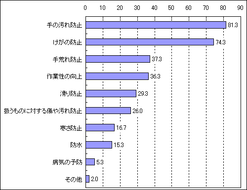 作業用手袋の総合メーカー(株)東和コーポレーションは、この度、作業用手袋に関するアンケートを実施しました(事前調査で作業用手袋を使用したことがある人の中から300人に回答をいただきました)。このアンケートは、毎日人々の手を守り続けている『働く手袋』にもっと関心を持ってもらうことを目的として制定した、10月29日「てぶくろの日」の活動の一環として行ったものです。その結果を見ると、作業用手袋を使う頻度は、「ほぼ毎日」10.7%使うという人から「年に数回」という人まで様々でした。作業用手袋を使用したのは主にどちらの場所(仕事での使用か家庭・趣味の場での使用)でしたか?と尋ねたところ、「どちらかといえば家庭、趣味の場で使用する」と答えた人が74.0%と大半を占めました。「どちらかといえば仕事で使用する」と答えた人は22.3%となっています。作業用手袋を使用または購入したのはどのような用途でしたか?と尋ねました。作業用手袋の用途として68.0%の人が「園芸・日曜大工・趣味・その他工作」を挙げています。次いで「機械・塗装・整備・修理作業」13.3%、「農業・漁業・林業」10.0%の順となっています。使用用途が「園芸・日曜大工」に集中していたことを考えると、用途に応じて作業用手袋の種類を使い分ける人の割合が4割以上もいるということはかなり多くの方が、目的ごとに手袋の種類を「使い分けている(「必ず、2種類以上を使い分ける」14.0%+「どちらかというと、2種類以上を使い分ける」29.7%)」と考えられます。作業用手袋の利用目的として、「手の汚れ防止」81.3%や「けがの防止」74.3%などのために利用している人が4分の3を占め、作業用手袋の役割として「安全性」が最も重要であるということが改めて数字で示されました。手袋は手を守るという目的以外にも、「作業性の向上」36.3%と、手以外のものを守る目的にも使われている事がわかります。作業用手袋は必要だと思いますか?と尋ねると、日頃作業用手袋を使用している人のうち95.4%の人が手袋は必要だと答えています(「なくてはならない」50.7%+「あるとよい」44.7%)。作業用手袋に対する不満点として、「手の蒸れ」36.3%や「ニオイ」32.7%、「丈夫さ」28.7%などが、作業用手袋を購入または選ぶ際のポイントとして、「素材」71.0%や「価格」65.7%、「サイズ」54.7%などが上位に挙げられています。作業用手袋1双(左右1組)の消耗期間はどのくらいですか?「1ヶ月以上」54.0%との回答が半数を超えています。「てぶくろの日」の認知度を見ると、認定されて間もないということもあり、「知っている」が4.0%、「聞いた事がある」が10.3%と低いものでした。