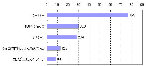 - チョコレート(材料ふくむ)はどこで買いますか?(バレンタインチョコをあげると回答した女の子:n=370)(上位5位まで)