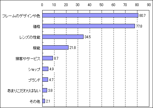 度入りメガネ、サングラス、ダテメガネ・・・いつの時代も、メガネは生活に欠かせないもの。では、家計を預かる主婦にとってメガネってどんな位置づけ?どんなのを買う?『メガネ』について聞いてみました!メガネを持っていますか?の問いに、「持っている」と答えた人は全体の92.5%。ダテメガネやサングラスを含めた「メガネ」と称するものを持っている人はこれだけ多いということです。では、メガネは何個くらい持っているのでしょうか?回答では「2~3個」54.9%と答えた人がいちばん多く、次いで「1個」30.9%、「4~5個」9.5%と続きます。では、メガネを買うのはどんなときでしょうか?「使っているメガネが壊れたとき」65.5%と「視力が変わったとき」63.8%の2つが多くなっています。しかし、注目すべきは「今のメガネに飽きた」26.3%、「欲しいフレームを見つけた」10.8%などの、おしゃれ買い換え派の存在。デザインも豊富でおしゃれなメガネが安く手に入るようになったことで、「メガネに飽きた」という、昭和の主婦には考えられない購買動機が生まれました。このおしゃれ買い換え派の存在は、前項で述べた「ひとり2~3個」持っているメガネが、「3~4個」、そして「それ以上」に増えていくことを十分に予感させます。メガネを買うときのこだわりは?の質問で、一番多かった回答は「フレームのデザインや色」80.7%、次に「価格」77.8%。やはりこだわるのはこの2点のようです。「レンズの性能」34.5%や「機能」21.8%が少なめなのは、コンタクト併用のおうちメガネ派でしょうか?お気に入りのメガネショップは?という設問では、一番多かった「Zoff」8.1%、次が「眼鏡市場」4.2%、「JINS」3.4%と続く結果となりました。主婦の9割が持っているメガネ。それだけに、「困ったエピソード」21.2%や「破壊エピソード」14.5%、「おもしろエピソード」10.6%などメガネにまつわるエピソードもさまざまでした。最後にあなたにとってメガネは?と尋ねてみたところ、「必需品・ないと困る」28.6%という回答が最も多く、「目」12.0%、「顔・体の一部」10.2%と合わせると半数近くになり、主婦たちがメガネとともに生活しているのがよくわかります。