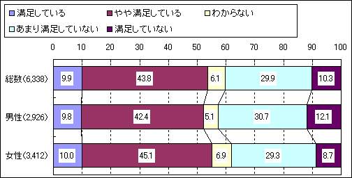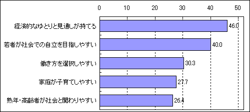 ((1)より続く)現在の社会において満足している点は何か聞いたところ、「良質な生活環境が整っている」33.8%を挙げた者の割合が最も高く、一方、満足していない点では、「経済的なゆとりと見通しが持てる」46.0%を挙げた者の割合が最も高い。国や地方公共団体では、様々な「公共サービス」を提供しているが、現在の公共サービスに全体として満足しているか、それとも、満足していないか聞いたところ、『満足している』とする者の割合が53.8%、『満足していない』とする者の割合が40.2%となっている。性別に見ると、『満足している』とする者の割合は女性で、『満足していない』とする者の割合は男性で、それぞれ高くなっている。全般的にみて、国の政策に国民の考えや意見がどの程度反映されていると思うか聞いたところ、『反映されている』とする者の割合が18.6%、『反映されていない』とする者の割合が78.7%となっている。性別に見ると、『反映されている』とする者の割合は男性で、『反映されていない』とする者の割合は女性で、それぞれ高くなっている。国の政策に国民の考えや意見が「ある程度反映されている」、「あまり反映されていない」、「ほとんど反映されていない」と答えた者に、どうすればよりよく反映されるようになると思うか聞いたところ、「政治家が国民の声をよく聞く」と答えた者の割合が27.5%、「国民が国の政策に関心を持つ」と答えた者の割合が20.2%、「国民が選挙のときに自覚して投票する」と答えた者の割合が15.3%、「国民が参加できる場をひろげる」と答えた者の割合が15.3%、「政府が世論をよく聞く」と答えた者の割合が14.1%、「マスコミが国民の意見をよく伝える」と答えた者の割合が5.1%となっている。性別に見ると、「政治家が国民の声をよく聞く」、「政府が世論をよく聞く」と答えた者の割合は女性で、「国民が選挙のときに自覚して投票する」と答えた者の割合は男性で、それぞれ高くなっている。現在の日本の状況について、良い方向に向かっていると思われるのは、どのような分野か聞いたところ、「科学技術」27.0%を挙げた者の割合が最も高く、以下「医療・福祉」22.4%、「通信・運輸」16.7%、「防災」14.8%などの順となっている。一方、悪い方向に向かっていると思われるのは、「景気」を挙げた者の割合が57.7%、「国の財政」を挙げた者の割合が55.7%と高く、以下「雇用・労働条件」52.3%、「外交」46.3%などの順となっている。