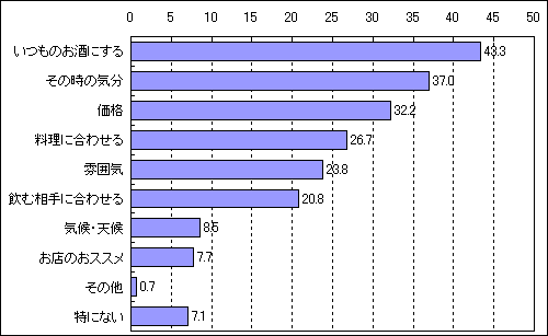 インターワイヤード(株)が運営するネットリサーチのDIMSDRIVEでは、『お酒』についてアンケートを行い、飲酒頻度、お酒選びのポイント、気をつけていることなどをまとめました。ふだん、お酒を飲むか尋ねたところ、「ほぼ毎日」21.8%、「週2~3日程度」14.6%、「週1日程度」11.4%の順となり、飲酒率は77.5%で、『週1以上』では57.7%と、半数以上の人が『週1以上』飲酒していることがわかりました。(ここからは、お酒を飲む人に尋ねました)どのようなお酒を飲むのか尋ねたところ、「ビール」70.1%、次いで「(発泡酒・第3のビールなど)ビールテイスト飲料」52.3%、「チューハイ・サワー・カクテル」50.2%が上位3位となりました。飲むお酒を決める際のポイントについては、「いつものお酒にする」43.3%、「その時の気分」37.0%、「価格」32.2%などが上位に挙げられました。『お酒の強さ』について、5段階評価で尋ねたところ、「かなり強い」7.4%、「やや強い」30.6%、「どちらともいえない」29.3%、「やや弱い」19.5%、「かなり弱い」13.2%となり、『強い(かなり強い+やや強い)』は38.0%、『弱い(かなり弱い+やや弱い)』は32.7%で、『強い』人の方が5.3pt多く、男女別で『強い』と回答した割合を見ると、男性38.5%、女性37.4%でした。男女の差はほとんどないようです。お酒が好きか?尋ねてみたところ、「かなり好き」29.4%、「やや好き」43.3%、「どちらともいえない」21.9%、「やや嫌い」4.4%、「かなり嫌い」1.0%となりました。どういった時にお酒を飲むのでしょうか?最も多かったのは「忘年会」72.2%、次いで「大晦日・お正月」66.5%、「新年会」61.5%と続き、いずれも年末年始のイベントでした。お酒を飲む際に気をつけていることでは、「飲み過ぎない」59.6%が最も多く、以下「なるべく食事をしながら飲む」37.5%、「翌日への影響」37.1%、「人に絡んだり迷惑をかけないように(酔いすぎない)」27.5%、「二日酔い」27.0%となりました。お酒を飲むとどうなる?最も多かったのは、「楽しくなる」62.2%、次いで「陽気になる」38.9%、「よく喋る」27.0%、「すぐ寝る」17.3%、「笑いたくなる」16.2%と続き、上位5つまでを見ると、お酒を楽しく飲んでいると自己評価している人が多いようです。最初の設問で、お酒は「飲めるが飲まない」と回答した人に、飲まない理由を尋ねました。最も多かったのは「お酒が好きではない」27.8%、次いで「健康のため」「お金がかかるから」同20.7%、「体調が悪くなる」13.1%という順でした。