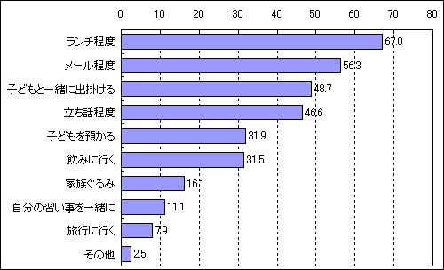 最近ドラマにも取り上げられたせいか、クローズアップされることの多い『ママ友』という独特の人間関係。子育て世代はどのように捉えているのでしょうか?調査してみました。『ママ友』でイメージするのは?尋ねました。「助け合える」56.6%や「気が合う」51.3%など、前向きな印象を持っている反面、「気を使う」39.1%や「面倒くさい」28.0%、「トラブルがある」24.5%など、ネガティブな面も見え隠れする結果となりました。また、『ママ友がいる』と答えた人は81.3%でした。ママ友との知り合う場所として一番多かったのは「幼稚園・保育園」77.4%でした。これは保護者として毎日の送迎や行事などで集まる機会が必然的に増えるからと思われます。また、どんなつきあいか?尋ねたところ、上位を占めていたのが「ランチ程度」67.0%、「メール程度」56.3%というものでした。ここで『程度』という言葉に注目すると、あえて『程よくおつきあいしたい』というニュアンスも含まれているように見えます。そして、呼び方についてみると、「○○ちゃん(くん)ママ」41.9%というママ友独特の呼び方は比較的健在でした。子どもあっての知り合い、という側面が強い『ママ友同士』にとっては依然として受け入れられているようです。ママ友と夫の話をしますか?「はい」と答えた人は76.0%。どんな話を?「夫の話=愚痴」49.5%のような結果になりました。他の回答も「旦那にもっと家事を手伝ってほしい(子育て・家事への参加)」23.1%、「ウチのだんなは~なのよ!(癖・性格)」3.8%など、ほぼ愚痴へとつながっていくような内容となりました。ママ友とトラブルになったことはありますか?「はい(ある)」と回答した人は35.5%、「子ども同士の喧嘩に親が口を出す」29.8%が最多でした。ママ友がいてよかったと思うことを教えてもらったところ、最も多かったのは子育てに試行錯誤する者同士で「悩みを相談し合える」35.5%でした。ママ友は、実に頼もしい存在のようです。また、主婦ならではのコミュニケーション能力のよさを活かして「情報交換できる」22.2%のも便利ですし、「子どもの面倒をお互い見る」17.6%など、困ったときに助け合えるのも心強いです。しかし、一方では、「悪口を言う」19.7%、「自分勝手・気まま」15.1%、「プライバシーに介入する」14.7%、「無神経・非常識・ずうずうしい」9.3%、「他の子が悪い、自分の子どもが正しい」7.9%などなど、確かに『ありえない!』と叫びたくなるほどのトラブルも。しかしこの回答をあえて反面教師として、ママ友とのおつきあいの際に参考にしたらいかかでしょうか?ひょっとしたら、コミュニケーション解決の糸口になるヒントがあるかもしれません。