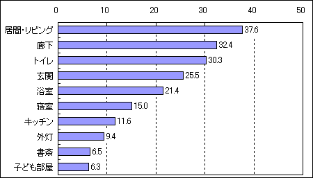 - LED照明は、ご家庭のどこで使用していますか?(上位10位、複数回答、LED照明使用者 n=1,711)(単位:%)