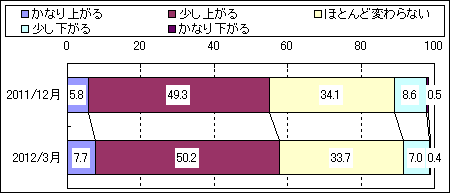 日本銀行は、全国の満20歳以上の個人を対象に「生活意識に関するアンケート調査(第49回)」を実施した。その結果を2011年12月の前回(第48回)調査の数値と比較した。1年前と比べた現在の景況感については、「悪くなった」との回答が1.9ポイント減少したことから、景況感D.I.は改善した。先行き(1年後)については、「悪くなる」との回答が4.0ポイント減少し、「良くなる」との回答も1.5ポイント増加したことから、景況感D.I.は改善した。金利水準の見方は、「適当な水準である」との回答が2.7ポイント減少し、「金利が高すぎる」「金利が低すぎる」との回答が増加した。現在の暮らし向き(1年前対比)については、「ゆとりがなくなってきた」との回答が3.3ポイント減少したことから、暮らし向きD.I.は改善した。1年前と比べた収入の増減では、「減った」との回答が減少し、「変わらない」との回答が増加した。一方、支出の増減については、「増えた」との回答が減少した。1年後を見た勤労者の勤め先での雇用・処遇の不安については、「少し感じる」との回答が減少し、「かなり感じる」との回答が増加した。1年前と比べた現在の物価に対する実感は、『上がった(「かなり上がった」と「少し上がった」の合計)』との回答が増加し、『下がった(「かなり下がった」と「少し下がった」の合計)』との回答が減少した。現在と比べた1年後の物価については、『上がる(「かなり上がる」と「少し上がる」の合計)』との回答が増加し、『下がる(「かなり下がる」と「少し下がる」の合計』との回答が減少した。