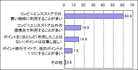 ローソン20代 89.0 87.0 75.0 29.0 27.0 32.0 17.0 30代 83.0 84.0 74.0 31.0 36.0 24.0 13.0 40代 85.0 80.0 77.0 26.0 19.0 24.0 13.0 50代 86.0 77.0 76.0 31.0 29.0 24.0 16.0 60代 83.0 78.0 76.0 26.0 23.0 24.0 14.0 - あなたは、コンビニエンスストアで使っているカードで貯まったポイントをどのように利用することが多いですか。(1つ選択)(単位:%)