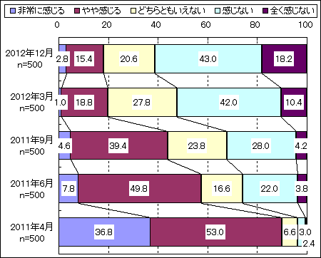 インターネット調査会社の株式会社マーシュでは、関東圏に住む20~69歳の男女を対象に、今回で5回目となる「震災後の生活に関するアンケート」を実施しました。はじめに、東日本大震災から1年と9ヶ月が経過し、現在の生活について回復・復旧を実感しているかを尋ねたところ、「回復・復旧を実感している(計)」は36.4%と、前回2012年3月から横ばいの結果となりました。次に、世間全体での自粛ムードについて、実感しているかを尋ねたところ、「自粛ムードを感じる(計)」は18.2%とこちらも前回とほぼ同率の結果となりました。震災前の生活に戻ってきたと実感する一方で、2割弱の人は自粛ムードを依然感じていることがわかりました。続いて、東日本大震災を機に生活上で変化したことを尋ねた結果、前回同様に「防災用品を準備するようになった」(33.8%)が最多で、「食品の購入時に産地を気にするようになった」(30.8%)、「ニュースを見るようになった」(25.2%)の順となりました。今回の調査結果では、「防災用品を準備するようになった」ならびに「水道水を飲まなくなった」以外の全項目で過去3回の調査結果を下回りました。この冬、節電に協力するために意識的に取り組んだことについては、「日中は照明を消す」(49.8%)が前回より約5ポイント上回ってトップとなり、次いで、「室温20度の心掛け」(34.0%)、「長時間非使用のプラグは抜く」(33.8%)が続きます。復旧・復興対策を目的とした政府の取り組みの中で進行速度が遅いと思われるものを尋ねたところ、「がれき除去・撤去」(60.4%)、「雇用の創出」(47.2%)、「災害廃棄物の処理」(40.4%)の順に多くなりましたが、いずれの項目も前回の調査結果を下回り、特に、「がれき除去・撤去」「再生可能エネルギー(太陽光発電や風力発電)の設置・促進」については、10ポイント以上の差がみられました。2012年12月7日(金)の三陸沖の地震(マグニチュード7.4)が起こった直後にとった行動について尋ねたところ、約6割が「テレビ、ラジオ、ネット等のニュースで状況を確認した」と回答しました。次いで、「その場で待機し(様子を見た)」(38.2%)、「家族の安否を確かめた」(29.6%)と続き、まずは冷静な判断をするといった行動が見受けられました。