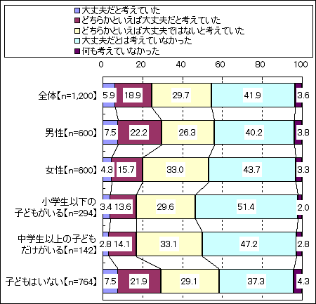 ((1)より続く)空中の放射性物質について、震災発生から震災後半年くらいまでの間に「大丈夫」と捉えていた割合は42.0%で、年代が高い人や小学生以下の子どもがいる人で危機感が高くなりました。現在では約6割が「大丈夫」と回答しています。福島第一原子力発電所については、震災発生から震災後半年くらいまでの間について、69.3%が「大丈夫だとは考えていなかった」という強い危機感を示しました。これに「どちらかといえば大丈夫ではないと考えていた」を加えると、87.8%が危機感を持ったことになります。特に女性では9割が危機感を感じていました。現在は、「大丈夫」と考えているのは16.1%にとどまり、8割以上が引き続き危機感を持っていることがわかりました。続いて、放射性物質が健康に及ぼす影響についての意識を尋ねました。震災発生から震災後半年くらいまでの間に7割以上が「大丈夫ではない」(計)と考え、危機感を持っていたことがわかりました。現在の意識についてみると、「大丈夫」とする割合は30.8%にとどまっており、年代が高い人や小学生以下の子どもがいる人を中心に、今も危機感があるようです。これらの不安感は、時とともに徐々に低下しており、特に震災から1か月から半年の間に、かなり軽減された様子がうかがえます。最後に、情報関連行動の面での実態と反省について尋ねました。「マスメディアだけでなく、ネットなどを使って多方面から情報収集」が62.1%と最も多く、次いで、「情報はよく確認してから取り入れる」54.4%、以下、「政府などから発表されるオフィシャルな情報だけでなく、多方面から情報を収集」42.0%、「GPS機能がついた携帯電話を持つ」42.0%と続きました。一方、「しておけばよかった」として上位に上げられたのが、「家族といざというときの連絡手段や行動について事前に取り決め」36.0%が最も多く、次いで、「予備のバッテリーや電力を持つ」32.3%、「情報はよく確認してから取り入れる」21.9%、「政府などから発表されるオフィシャルな情報だけでなく、多方面から情報を収集」20.2%、「マスメディアだけでなく、ネットなどを使って多方面から情報収集」19.3%の順に多くなりました。