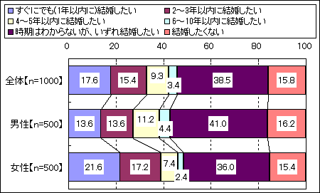 ((1)より続く)これまでにパワースポットに行ったことがある回答者に、行った理由を聞いたところ、「観光目的で」(58.2%)が最も多く、「リフレッシュしたいから」(36.1%)、「恋愛・結婚運を上げたいから」(30.4%)、「癒されたいから」(28.6%)が続きました。男女別にみると、“癒やし”を求めてパワースポットを訪れているのは男性よりも女性で多い傾向がみられ、「癒やされたいから」は男性の19.6%に対し、女性では36.3%となり、特に30代女性では40.6%になりました。最後に、恋愛に関する経験を聞いたところ、“パワースポットで恋愛成就・縁結び祈願”をしたことがある割合は女性の方が高くなり、男性の25.6%に対し、女性では40.8%になりました。現在、恋人がいる割合は、パワースポットで恋愛成就・縁結び祈願をしたことがある層では47.0%、パワースポットで恋愛成就・縁結び祈願をしたことがない層では29.3%と、パワースポットで祈願したことがある層の方が高くなりました。続いて、恋愛をしているとありがちな“あるある”について聞いたところ、「友達以上恋人未満の関係」を経験しているのは58.0%と約6割が経験している結果となりました。Facebookでは、登録者名で簡単に検索できますが、「SNSで元カレ・元カノの名前を検索」したことがあるのは23.0%と約4人に1人の割合でした。また、女性の方が、占い好きが多いと言われていますが、「片思い相手の名前で姓名判断」(男性34.0%、女性57.0%)の経験率は女性の方が高くなりました。結婚したいかどうか尋ねた結果は、『結婚したい』84.2%となりました。結婚願望のある842名に、いくつかの婚活を提示しどの程度行いたいか聞いたところ、「街コン婚活」(男女が定められた飲食店を巡る町ぐるみの大規模な合コン「街コン」を活用した婚活)を『行いたい』(「非常に行いたい」と「やや行いたい」の合計)とした割合は30.5%、「バスツアー婚活」(男女が観光バスに乗り、いろいろな観光スポットを一緒に巡りなら親交を深めていく婚活)は25.3%、「結婚式婚活」(友人・知人の結婚式に出会いを求めて参加する婚活)は20.3%、「ソーシャル婚活」(Facebookなどのソーシャルネットワークサービスを活用した婚活)は11.6%となりました。また、お見合いをしたことがあるか聞いたところ、結婚願望のある842名では、「ある」7.7%、「ない」92.3%となり、性年代別にみると、30代女性が最も高く7人に1人(14.1%)となりました。