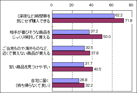 ((1)より続く)贈り物を購入する際に、店舗で購入するよりも通販で購入する方が良いと感じる点を質問したところ、「(深夜など)時間帯を気にせず購入できる」(62.2%)、「相手が喜びそうな商品をじっくり検討して買える」(37.2%)、「ご当地ものや海外ものなど、近くで買えない商品が買える」(32.5%)などが上位に挙がりました。購入者が享受する利便性の面だけでなく、受け取る相手の満足度から考えても通販の方が良い、との意識があるようです。特に、実際に通販で贈り物の購入をした経験がある人はその傾向が強く、「相手が喜びそうな商品をじっくり検討して買える」は半数(50.0%)を占めました。《職場での贈答習慣》についてみると、「(部下や同僚や上司への)結婚祝い」(27.3%)や「(部下や同僚や上司への)出産祝い」(23.0%)が2割半ほどみられ、結婚祝いや出産祝いなど、職場内であっても“個人的”なお祝いの印象のある贈り物は習慣化の割合が高いようです。続いて、《プライベートでの贈答習慣》についてみると、異性に渡す贈り物では習慣化の割合が高く、「(パートナーや好きな異性への)誕生日プレゼント」は31.6%となりました。友人に渡すプレゼントは、10代や20代では「(友人への)誕生日プレゼント」(10代 28.3%、20代 26.9%)、30代では「(友人への)結婚祝い」(30.5%)や「(友人への)出産祝い」(27.5%)の習慣化率が、それぞれ高くなりました。贈り物を通販で購入したことがある人はこれらのプライベートな贈り物の習慣化率が高くなり、「(友人への)出産祝い」(25.1%)は通販で購入したことがない人(8.5%)の約3倍の割合になりました。また、SNSのアクティブユーザー(いずれかのSNSを月に1回以上利用している人)もプライベートな贈り物の習慣化率が高くなる傾向がみられ、「(パートナーや好きな異性への)クリスマスプレゼント」(27.2%)では、SNSの非アクティブユーザー(11.6%)やSNS非ユーザー(14.4%)の約2倍の割合となりました。出産祝いで贈られた贈り物の中で最も喜ばれていたものは「祝い金・金券・ギフト券」(67.9%)でした。また、若い年代では、「知育グッズ」(30代 23.9%)や「ママへのご褒美」(30代 11.9%)、「チャイルドシート」(30代 11.9%)などで喜ばれる割合が高くなっています。30代は今回の調査の中で“贈り物選び”や“購入”でインターネットを活用する割合が高い特徴がみられました。
