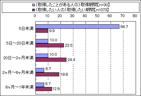- 育児休業の取得期間/取得したい育児休業期間(単一回答形式、対象:育児休業の取得期間…育児休業を取得したことがある人、取得したい育児休業期間…将来的に育児休業を取得したいと思う人)(単位:%)