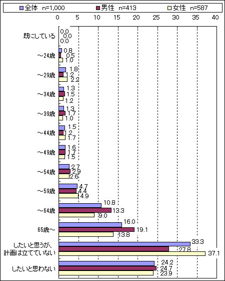 ((1)より続く)((1)より続く)これからの“社会人生活”は何色のイメージか、自由回答で募ったところ、最も多かったのは「白」(172件)となりました。次いで、「灰色/グレー」(143件)、「青/ブルー」(122件)、「黒/真っ黒」(99件)が続きました。選んだ理由について、最も多かった「白」に対しては、「まだ経験もなく色のない状態。働くことで自分の色に染めていく。(社会人1年生、22歳男性)」や「まだまだ覚えることがたくさんあるので、基礎がしっかりできてから自分の色を出そうと思います。(社会人2年生、23歳女性)」といった意見が寄せられました。次に、全回答者に対し、ライフイベントや大きな買い物を何歳頃までにしたいと考え、計画を立てているか質問しました。まず、≪結婚≫については、「~24歳」が7.9%、「~29歳」が41.2%、「~34歳」が13.5%となり、平均年齢は30.0歳となりました。≪出産(第一子の誕生)≫については、「~29歳」が32.3%、「~34歳」が22.1%となり、平均年齢は31.6歳となりました。また、女性は男性より「~29歳」が高く(女性39.4%>男性22.3%)なっています。また、≪マイカーの購入≫は平均29.6歳、≪マイホームの購入≫は平均36.8歳となりました。他方で、≪マイカーの購入≫を「したいと思わない」は15.0%、≪マイホームの購入≫を「したいと思わない」は17.8%と、これらの購入意欲がない新社会人も少なくないことがわかりました。さらに、≪リタイア生活≫について聞いたところ、「したいと思うが、計画は立てていない」(33.3%)が多く、まだまだリタイア後の生活を考えていない人が3人に1人の割合となりました。社会人2年目に、仕事で覚えた知識や仕事の忙しさを周囲にアピールし、ことさら仕事ができるように演じてしまうことを、インターネット上などで“社二病(しゃにびょう)”と言い表すことがあるようです。そこで、社会人2年生に対し、社会人生活の影響で、プライベートでついついやってしまう行動について聞きました。その結果、≪仕事の忙しさアピール≫は、「頻繁にある」が17.2%、「時々ある」が37.2%と、合計で半数以上の人が「ある」(54.4%)と回答しました。また、≪仕事の愚痴≫を言ってしまうことが「ある」割合は76.2%となっています。最後に、全回答者に対し、先輩社会人に言われたら、やる気を奪われてしまうセリフは何か聞いたところ、最も多く選択されたのは、「この仕事向いてないんじゃない?」(44.9%)という結果になりました。