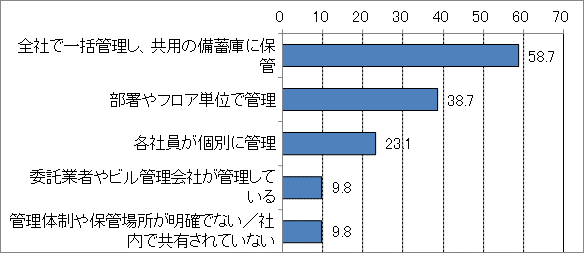 株式会社キングジムでは、近年相次ぐ自然災害や、それに伴う国民の防災意識の高まりを受け、企業の防災に関する意識調査を実施しました。はじめに、あなたが勤めている会社では防災備蓄を行っていますかと尋ねたところ、約8割の79.3%が防災備蓄を行っていることが分かりました。また、備蓄品は、いざという時にすぐ使える状態ですかという質問に対しては、約半数が『使える状態にある』と回答した一方、「一部不安を感じている」37.8%、「どこにあるかも正直わからない」7.1%と回答した企業も約半数にのぼり、“備えているが実用面で万全ではない”という企業が多い実態が明らかになりました。オフィスの防災備蓄について、不安を感じることがありますかと尋ねたところ、約6割の企業が『不安に感じている(「不安に感じる」22.9%、「どちらかというと不安に感じる」40.4% 計)』ことが分かりました。さらに、その理由を尋ねたところ、「点検・更新が行き届いていない」51.2%が最多、次いで「備蓄品の場所が把握されていない」34.0%、「使い方が分からない/マニュアルがない」28.4%といった課題が多く挙げられました。このことから、“備えるべき”という気持ちはあるものの“実行・継続”の仕組みが伴っていないことが分かりました。企業の防災備蓄に関して、管理体制および保管場所について尋ねたところ、「全社で一括管理し、共用の備蓄庫に保管」58.7%が最多の一方、「部署やフロア単位で管理」が38.7%、「各社員が個別に管理」が23.1%という結果となり、働き方やオフィス環境の多様化に伴い、防災備蓄スタイルも細分化していることが分かりました。理想的なオフィスの防災備蓄に求める条件を尋ねたところ、「すぐ使える!(使い方、展開が簡単)」49.3%が最多となりました。次いで、「収納しやすい(省スペース)」「管理・点検が簡単」がともに37.1%となりました。このことから、企業は「使いやすさ・省スペース・簡単管理」という条件を重視し、管理や保管の負担が少なく、日常業務の中で運用できる防災備蓄を求めていることが分かりました。