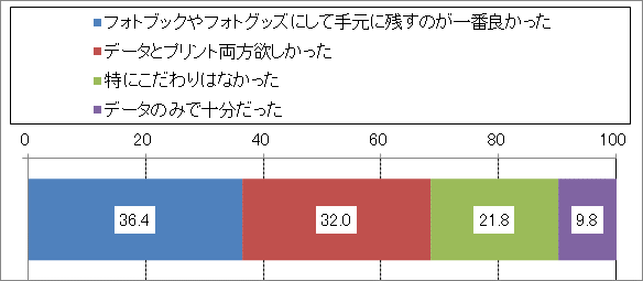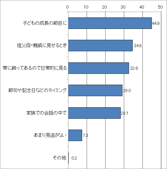 ((1)より続く)次に、「データだけで保存している」と回答された以外の、七五三写真を“カタチに残された”方に、どのようなときにフォトブックやフォトグッズで七五三写真を見返していますかとお聞きしたところ、約9割以上の方が何らかのタイミングで見返していることがわかりました。特に「子どもの成長の節目に」44.9%、「祖父母・親戚に見せるとき」34.6%、「常に飾ってあるので日常的に見る」32.6%といったシーンが多く挙げられています。「家族での会話の中で」28.1%という方も多く、カタチに残すことで家族の記憶や会話を育む価値が見えてきました。「データだけで保存している」と回答された方のうち、「ほとんど見返さない」方は41.2%、「存在を忘れていた」方は11.8%にのぼりました。一方で、「年に数回以上見返す」と回答された方はわずか14.7%にとどまっています。フォトブックやフォトグッズなど“カタチあるもの”として残すと、写真の価値が高まると感じますかとお尋ねしたところ、『高まる』と感じる方は全体の91.0%にのぼりました。「とてもそう思う」43.6%と「ややそう思う」47.4%が大半を占め、否定的な回答はわずか9.0%にとどまります。また、フォトブックやフォトグッズがあることで、お子さま自身も写真を見る機会が『増える』と考える方は全体の88.6%にのぼりました。「とてもそう思う」41.0%と「ややそう思う」47.6%が大多数を占め、否定的な回答はわずか11.4%にとどまります。最後に、七五三の思い出をどのように残すのが理想的だったと、今振り返って感じますかとお聞きしました。「フォトブックやフォトグッズにして手元に残すのが一番良かった」36.4%、「データとプリント両方欲しかった」32.0%となり、約7割の方が“カタチに残す価値”を認める結果となりました。今回の結果から、写真の保存方法がデジタル一辺倒ではなくなりつつある現状が見えてきます。写真を“データ”と“カタチ”の両面で残すニーズが高まっており、保存方法のハイブリッド化が今後のトレンドといえそうです。