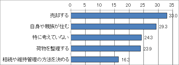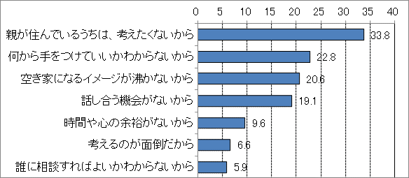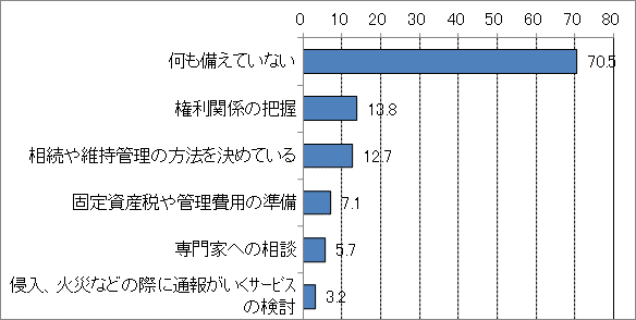 セコム株式会社では、持ち家に住む親と離れて暮らす全国の30歳~69歳の男女を対象に、離れて暮らす親に関する意識調査を実施しました。はじめに、実家の防犯対策について尋ねたところ、『不安を感じている(「とても感じている」13.0%、「やや感じている」48.0% 計)』と回答した人は全体の61.0%に上りました。実家が将来的に空き家になることに対して、『不安を感じている(「とても感じている」13.8%、「やや感じている」37.1% 計)』人は全体の50.9%となりました。不安の要素としては「相続や遺品の処分」54.7%が最多、次いで「物の処分や片付け」53.0%という結果で、現実的な負担への懸念が目立ちました。一方で、「防犯面」27.4%、「火災」21.1%といった安全面への不安も一定数あり、空き家の適切な管理や見守りの重要性がうかがえます。実家が将来空き家になったときの備えを聞いたところ、「何も備えていない」70.5%が最多で、7割が対応を講じていないことが明らかになりました。現在考えている具体的な対応方法については、「売却する」33.0%が最多、次いで「自身や親族が住む」29.3%、「特に考えていない」24.3%という結果となりました。「特に考えていない」理由は、1位「親が住んでいるうちは、考えたくないから」33.8%、2位「何から手をつけていいかわからないから」22.8%、3位「空き家になるイメージが沸かないから」20.6%でした。