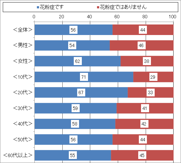 株式会社ウェザーニューズでは、花粉症の発症率や対策の実態を調査するため、スマホアプリ『ウェザーニュース』を通じて「花粉症調査2026」を実施しました。はじめに、あなたは花粉症ですか?と質問し、「花粉症です」「花粉症ではありません」の2択で回答していただきました結果、「花粉症です」と回答した方は56%で、約2人に1人以上が花粉症ということがわかりました。性別でみると、花粉症の方の割合は男性54%、女性62%で、男性よりも女性の花粉症の方が多いことがわかります。また年代別にみてみると、10代と20代の発症率が高く、10代では7割が花粉症でした(◆参考資料◆都道府県別にみると、最も花粉症の方の割合が高かったのは徳島県で69%、2位は栃木県と埼玉県で64%でした)。ウェザーニュースでは毎週、花粉症の発症や対策の状況に関する調査を行なっています。1月26日に実施した花粉症の症状に関する調査では、「花粉症ではない」を除くと、52%の方がすでに花粉を感じていることがわかりました(「けっこう感じる」7%、「ちょっと感じる」45%の合計)。1月12日の同調査と比較すると、すでに症状の出ている方が16pt増加しています。花粉症対策を始める時期について質問したところ、「花粉症ではない」を除くと、「飛散開始前」が41%、「アレルゲン免疫療法で年単位」が3%、「症状が出てから」が42%、「花粉症だけど何もしない」が14%でした。「飛散開始前」と「アレルゲン免疫療法で年単位」の回答を合わせて集計すると、全国平均で44%の方は事前に対策を始めていることが分かりました。性別でみると、男性よりも女性の方が事前対策をする方が多くなりました。男性よりも女性の方が花粉症の方の割合が多く、発症率の差が事前対策への意識の差につながっていると考えられます。年代別にみると、20代以下は「症状が出てから」が半数近くを占めますが、30代以降は「飛散開始前」に対策を始める割合が40%を超え、経験に基づいた事前対策が増える傾向にあります。一方、10代では「アレルゲン免疫療法で年単位」の回答が他の世代と比べて多く、若年層ほど長期的な体質改善を選択する動きがみられます。