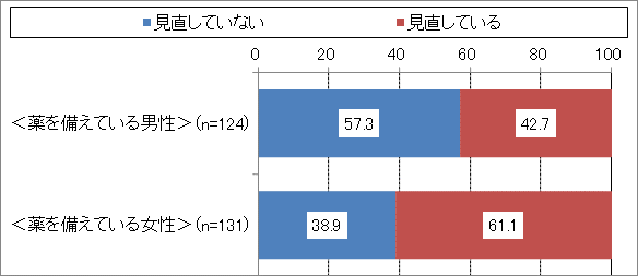 総合かぜ薬【ルル】を販売する第一三共ヘルスケア株式会社では、全国の20代~60代の男女を対象に、常備薬に関する実態調査を実施しました。はじめに、体調を崩した際に備えて薬を常備していますか?とお尋ねしたところ、約1割(7.0%)の方が「万全に備えている」、約4割(44.0%)の方が「まあまあ備えている」と回答され、あわせて全体の約5割(51.0%)の方が『薬を常備している』ことが分かりました。さらに、薬を『備えている』と回答された方に常備薬の見直し(使用期限や効果などの確認)の有無をお聞きしたところ、2人に1人(47.8%)が「見直していない(確認していない)」と回答されました。薬を備えている一方で、定期的に確認する必要性が十分に浸透していない実態が明らかになりました。また、男女別に比較したところ、男性の約6割(57.3%)、女性の約4割(38.9%)が「見直していない(確認していない)」と回答されました。男女間で18.4ptの差が見られ、薬の確認や管理においては、男性の方が見落としやすい傾向があることが分かりました。常備薬の保管場所についてお尋ねしたところ、約4割(38.8%)の方が「薬を収納するための専用の箱」で管理されている一方、「引き出し」27.8%や「空き箱などの簡易的な箱」25.2%に保管されているという結果になり、人によって保管方法にばらつきがあることが見られました。また、常備薬には使用期限があることについて、全体の9割以上(92.2%)の方が「知っている」と回答され、広く認知されていることが分かりました。一方で、使用期限切れの薬を飲んだ経験の有無をお聞きしたところ、2人に1人(48.2%)が「飲んだことがある」と回答される結果になり、常備薬の使用期限については広く認識されているものの、期限切れへの事前準備は限られていることがうかがえました。